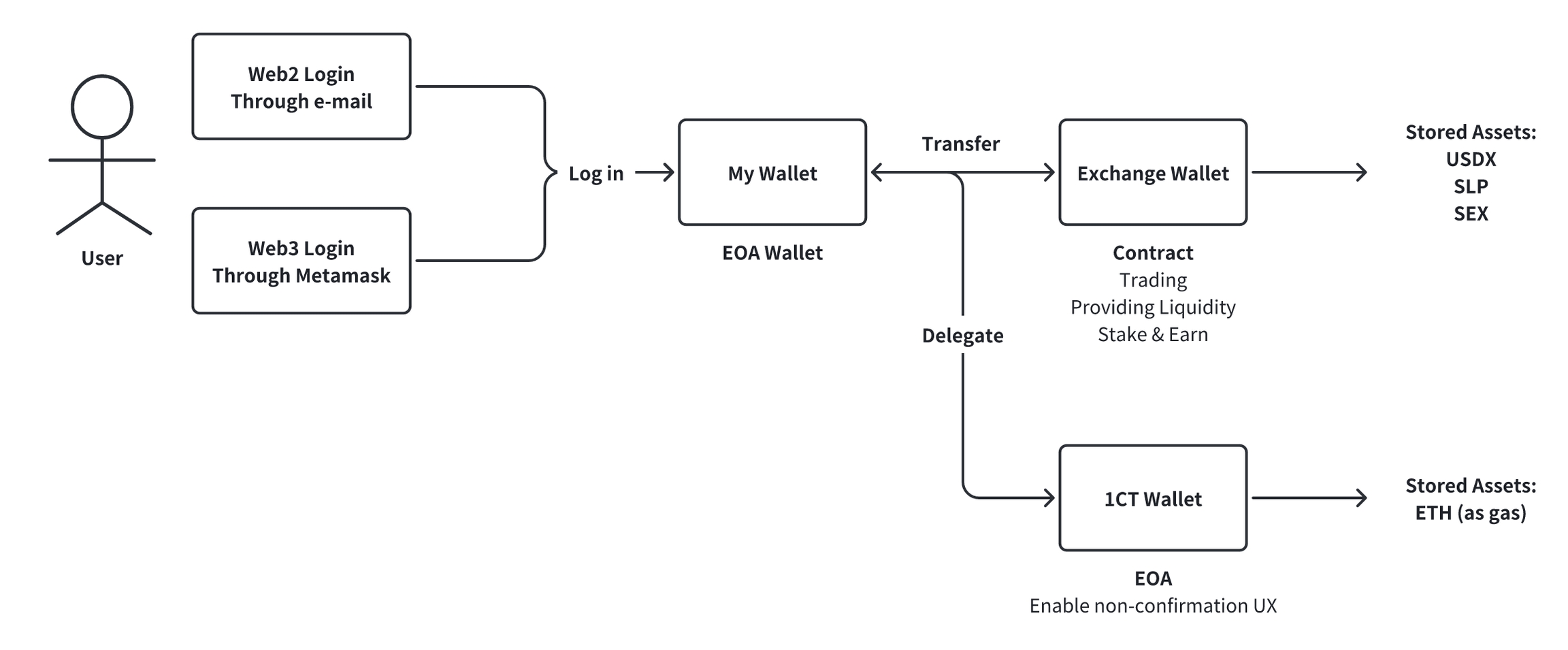 "My Wallet" is the user's self-owned EOA wallet. Web3 users can use metamask to create EOA wallets, while Web2 users can use emails, phone numbers, and other web2 accounts to create EOA wallets through Particle. Users need to transfer funds from My Wallet to the Exchange Wallet in order to engage in trading, staking, and providing liquidity.