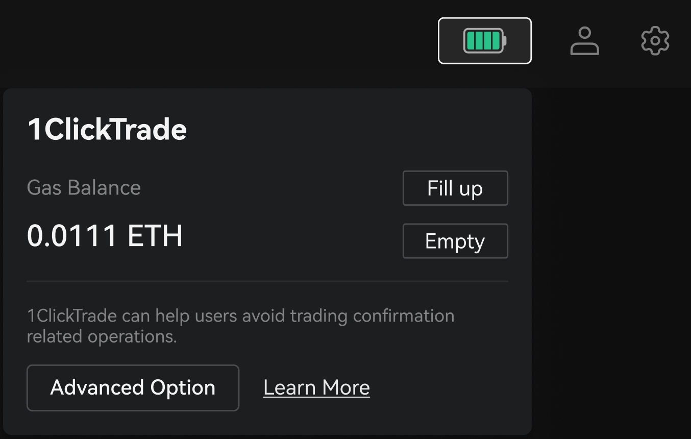 The battery icon will charge up as you fill up your 1CT.You can now start trading without the need for constant confirmation prompts from wallets like Metamask.