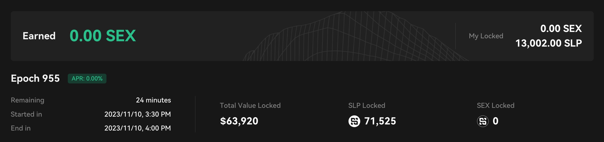 You can view all your staked assets at the bottom of the page under the "Locked" tab.Each small card displays details about the staked asset type, the quantity of staked assets, current SEX reward amounts, staking progress, and more.Clicking on a card will provide additional relevant information.