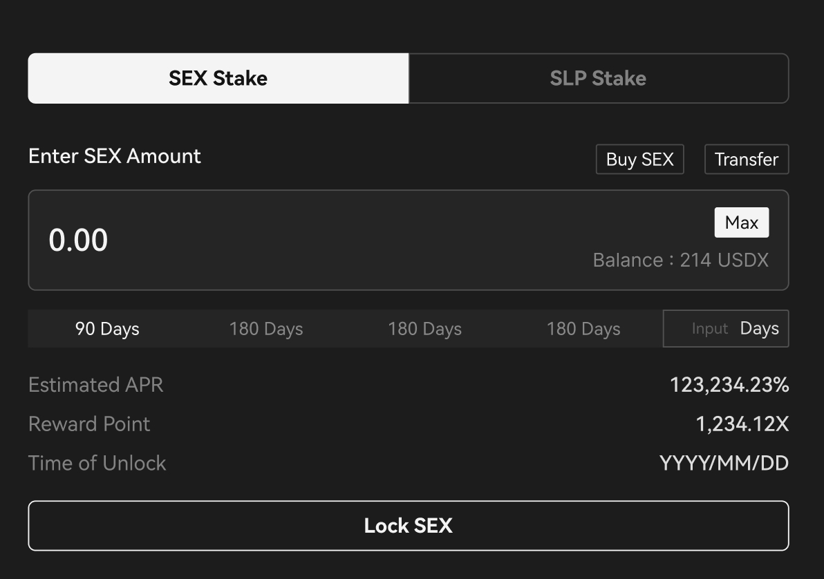 Enter the amount of SEX you want to stake and the lock period.