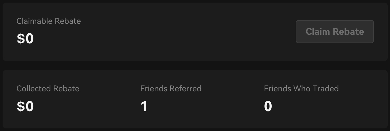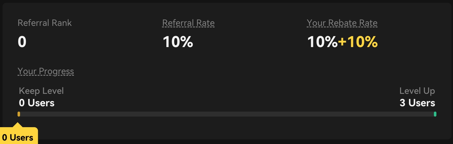 You can view your referral rank, referral rate, and the rebate rate you are enjoying on the referral dashboard. Additionally, you can monitor the progress of your referral rank upgrades.