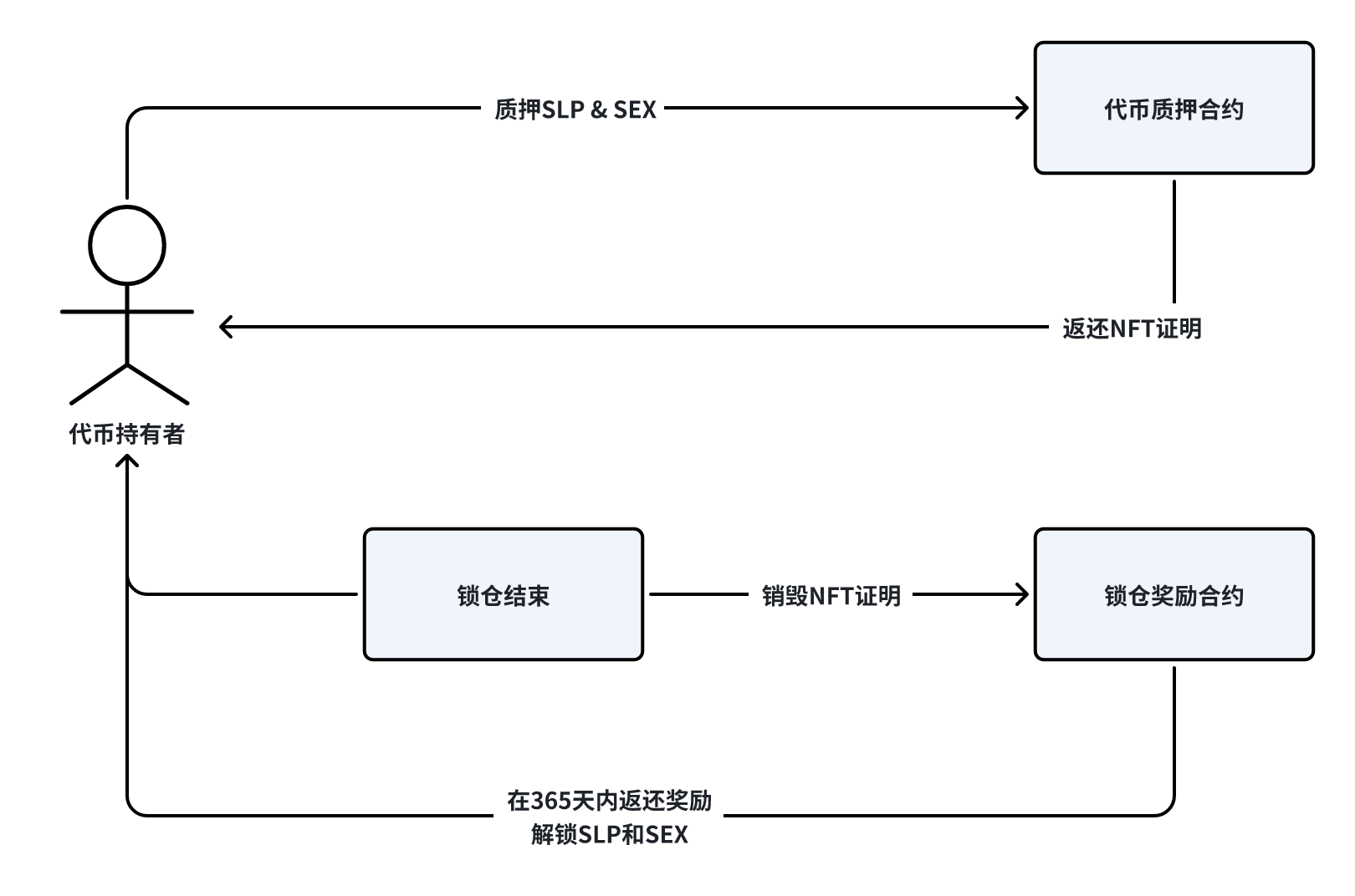 代币持有者可以质押其持有的SEX和SLP,质押的时间周期为30~720日。单次质押时间越长,用户潜在的收益就越高。在质押期间,被质押的代币将无法提取或转移。参与质押后用户将会获得以NFT形式表现的质押凭证。质押时间到期后,代币持有者可以通过销毁NFT凭证来赎回对应数量的质押代币。质押产生的收益将在解锁后的365天内以线性方式释放给代币持有者。