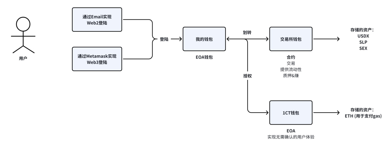 “我的钱包”是用户自己拥有的EOA钱包。Web3用户可以使用Metamask和OKX钱包创建EOA钱包，而Web2用户可以通过Particle 钱包使用电子邮件、电话号码和其他Web2账户创建EOA钱包。用户需要将资金从“我的钱包”划转到“交易所钱包”才能进行交易、质押和提供流动性。