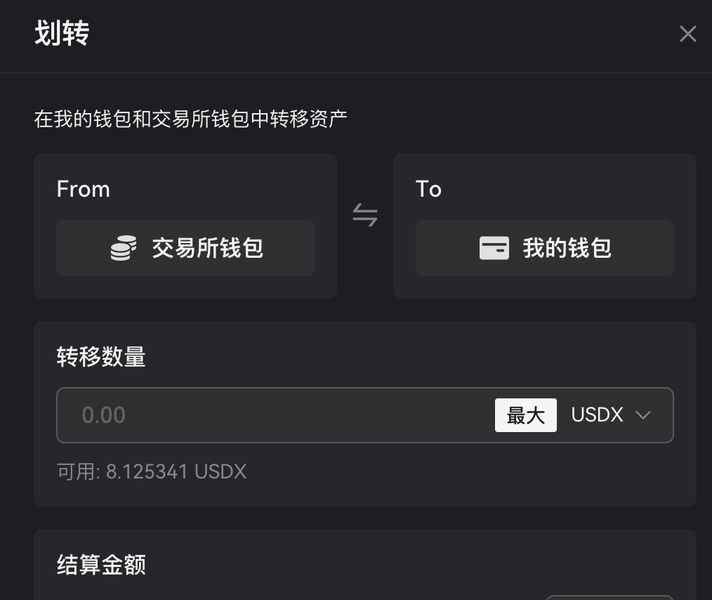 只有交易所钱包内的资金才能用来期货交易、质押。划转入交易所钱包的\*USDT, USDC, USDC.e, 和 DAI都将被转换为USDX。&#x20;